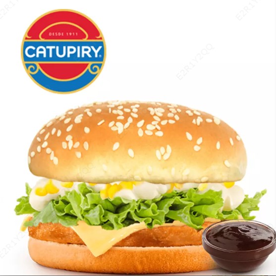 Pão com gergelim, Hambúrguer de frango empanado (feito 100% de peito de frango), Queijo, Milho, Catupiry Original, Alface, Barbecue e Maionese Defumada.