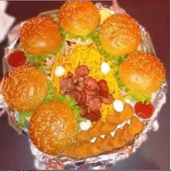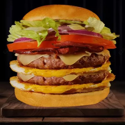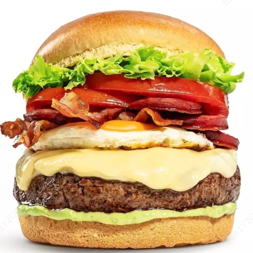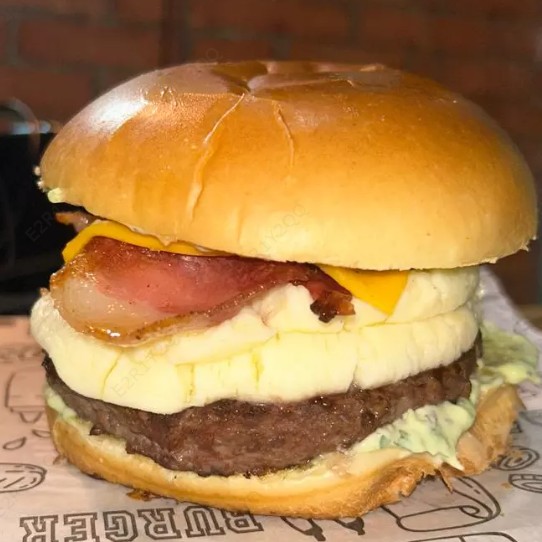 Pão Brioche, 2x Hambúrgueres Artesanal de Costela, 2x Ovos, Bacon, Queijo, Calabresa, Alface, Tomate, Cebola Roxa e Maionese Caseira Temperada.