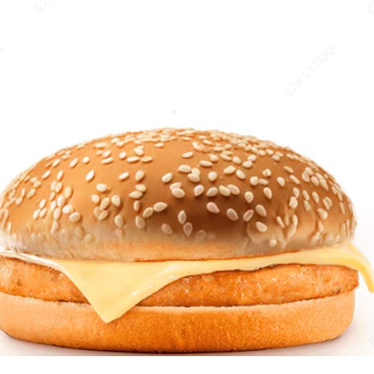 Pão com gergelim, Hambúrguer de frango empanado (feito 100% de peito de frango), Queijo e Maionese Defumada.