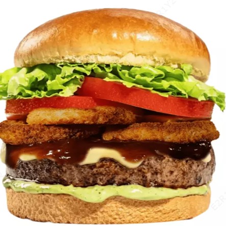 Pão Brioche, Hambúrguer Artesanal de Costela, Onion rings, Queijo, Barbecue, Alface, Tomate, Cebola Roxa e Maionese Caseira Temperada.