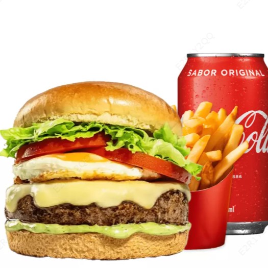 1 X- Egg (Pão Brioche, Hambúrguer Tradicional, Queijo, Ovo, Alface, Tomate, Cebola Roxa e Maionese Caseira Temperada.) +1 Batata Frita pequena (promocional) +1 Bebida