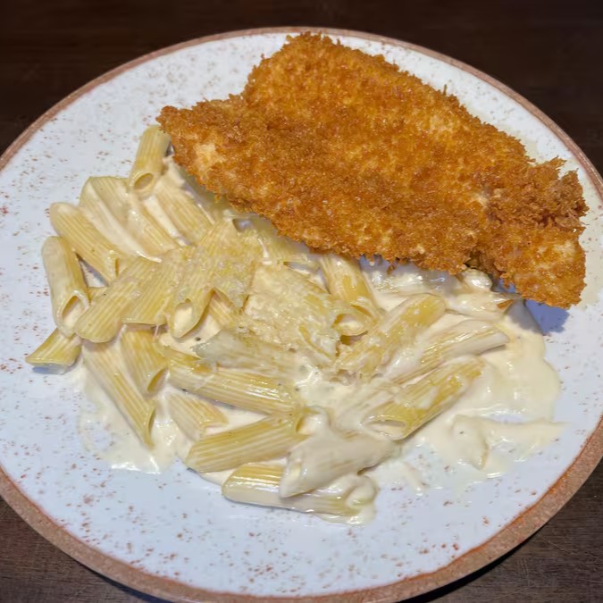 Penne ao molho Alfredo e filé de frango crocante.