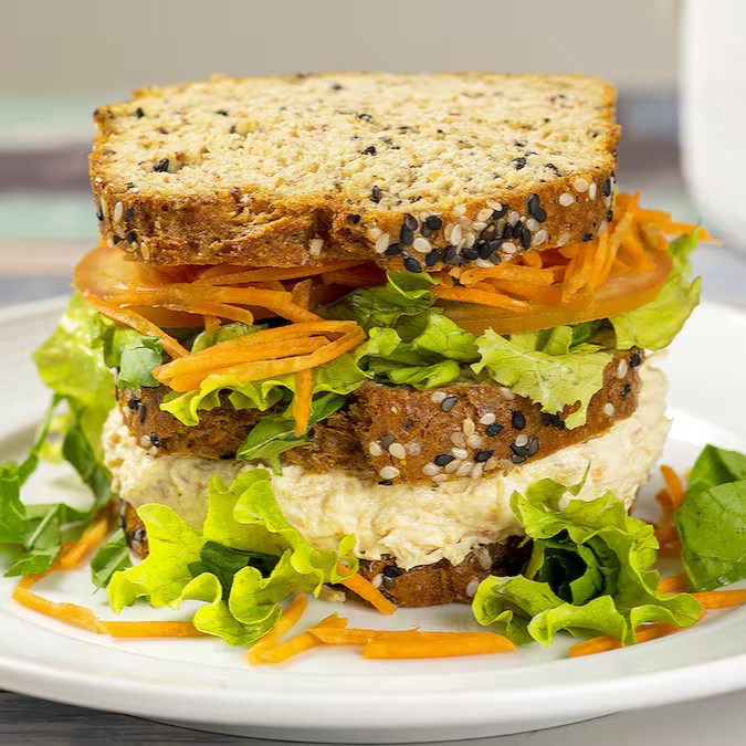 Sanduíche low carb de frango com cream cheese (280g), feito com pão especial, pasta de frango cremosa, cream cheese e folhas frescas. Acompanha suco natural de 500ml. Opção leve, saudável, sem glúten e saborosa.