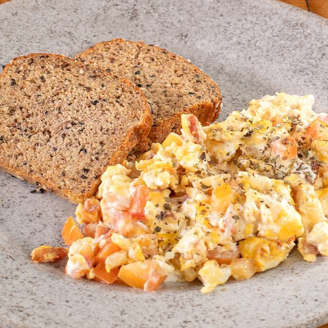 Pão low carb de fabricação própria tostado com azeite e ervas. Acompanha ovos mexidos, cream cheese, bacon e tomate