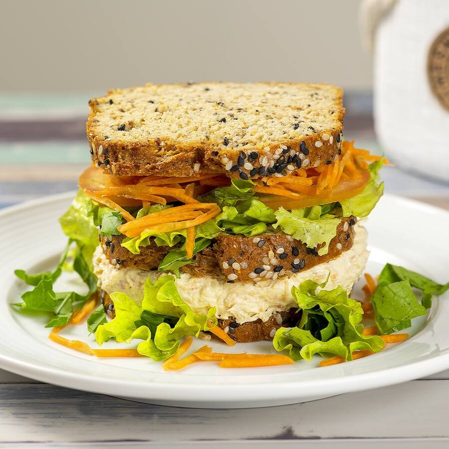 Sanduíche low carb de frango com cream cheese 280 g (sem glúten/contém lactose): pão low carb recheado com pasta de frango com cream cheese, folhas, cenoura e tomatinhos.