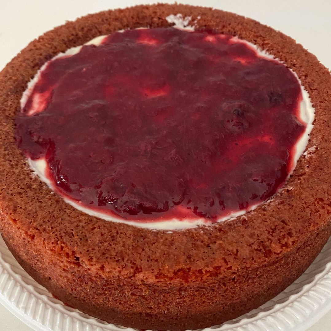 Bolo caseiro, massa fofinha com geleia caseira de frutas vermelhas e um delicioso creme de ninho.