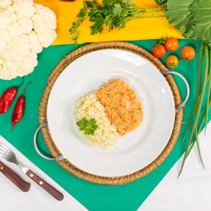 Este delicioso Fricassê de Frango, livre de lactose e glúten, é cuidadosamente preparado com peito de frango suculento e um mix de especiarias. Acompanha nosso inovador 'Arroz Fake' de Couve Flor, que proporciona uma experiência gastronômica única, sem abrir mão da saúde.