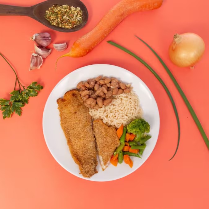 Sabor leve com aquele toque caseiro! Filé de Saint Peter empanado na medida certa, servido com arroz branco soltinho, feijão carioca com bacon e um mix de legumes frescos (brócolis, cenoura e vagem) salteados no azeite com cebola e sal rosa. Uma refeição completa, equilibrada e cheia de sabor de verdade!