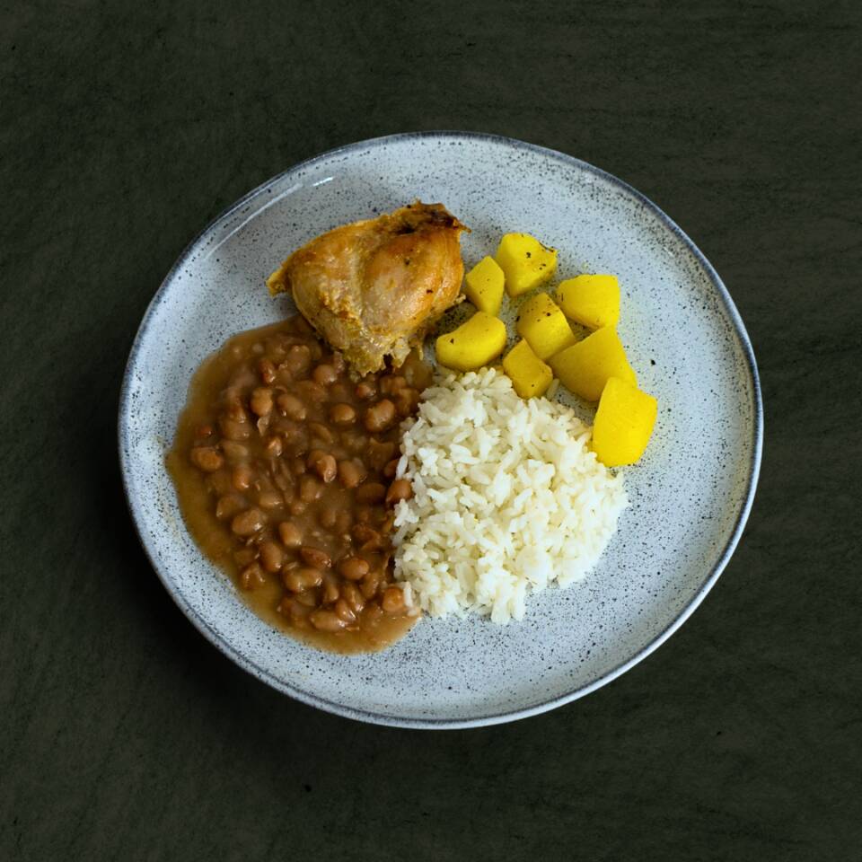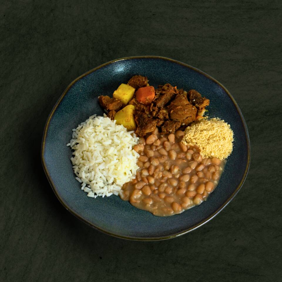 Nosso patinho bovino em cubos é o protagonista, cozido à perfeição com cebola, alho e folhas de louro. Acompanha arroz e feijão, complementado por cenoura, batata e tomate. Acompanha farinha de mandioca para um toque crocante, regado com azeite de oliva extra virgem. Temperado com sal rosa, cheiro verde, páprica doce, chimichurri e pimenta do reino. Serve 1 pessoa (300g)
