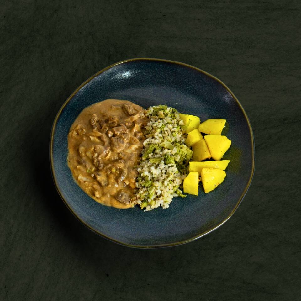 Nosso suculento patinho bovino é preparado em um cremoso strogonoff com molho de tomate (tomate, azeite de oliva extra virgem, sal rosa, alho e manjericão), creme de leite zero lactose, ketchup, mostarda e cogumelos fatiados. Acompanha arroz integral, batata inglesa e brócolis. É temperado com cebola, azeite de oliva extra virgem, sal rosa, alho, páprica doce e chimichurri. Serve 1 pessoa (300g)