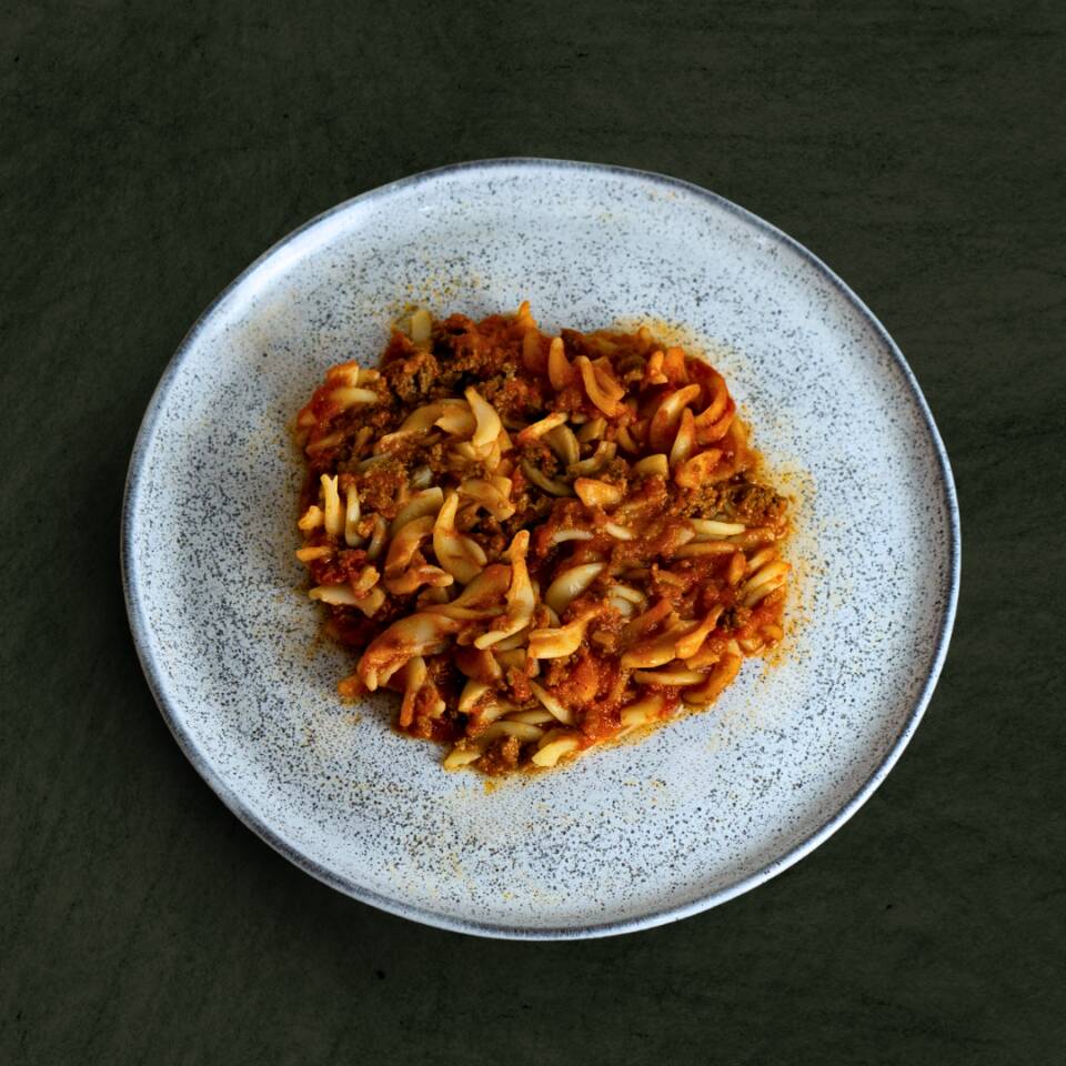 Nosso delicioso molho à bolonhesa, feito com tomate, azeite de oliva extra virgem, sal, alho e manjericão fresco, envolve o macarrão sem glúten e a saborosa carne bovina. Finalizado com cebola, sal, chimichurri, alho, páprica, mais azeite de oliva extra virgem e manjericão fresco. Serve 1 pessoa (300g)