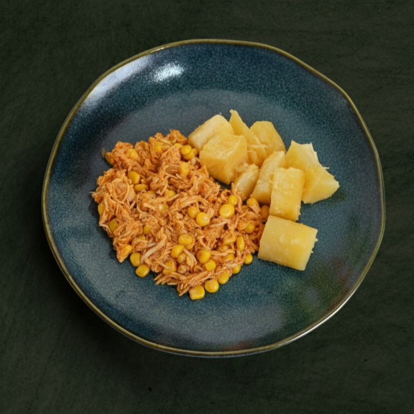 Nosso peito de frango é preparado cremoso com molho de tomate, batata inglesa, milho e ervilha. Acompanha mandioca sautée. Temperado com cebola, alho, azeite, manteiga zero lactose, sal rosa, orégano e chimichurri. Serve 1 Pessoa (300g)