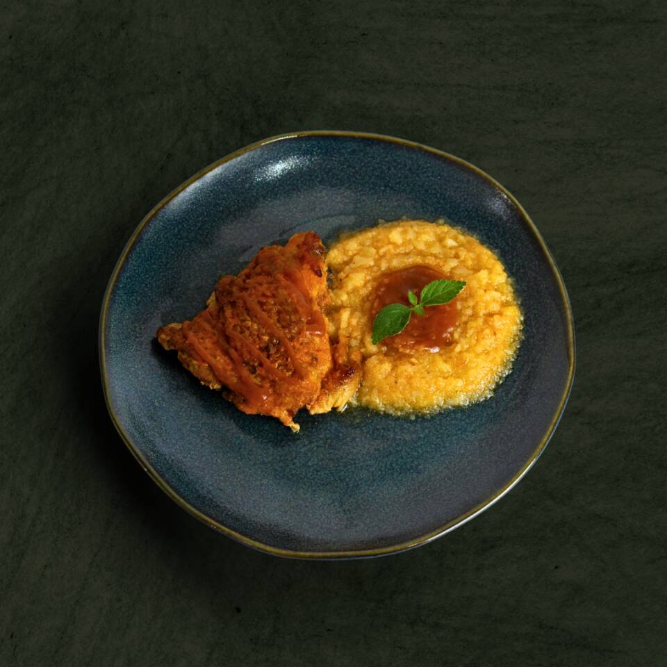 Nossa suculenta sobrecoxa de frango é preparada em um saboroso molho de tomate (com tomate, azeite de oliva extra virgem, sal rosa, alho e manjericão). Acompanha uma polenta cremosa feita com farinha de milho e margarina. O prato é temperado com cebola, sal rosa, alho, páprica doce, mostarda em pó, lemon pepper, cúrcuma, orégano e pimenta do reino. Serve 1 pessoa (300g)