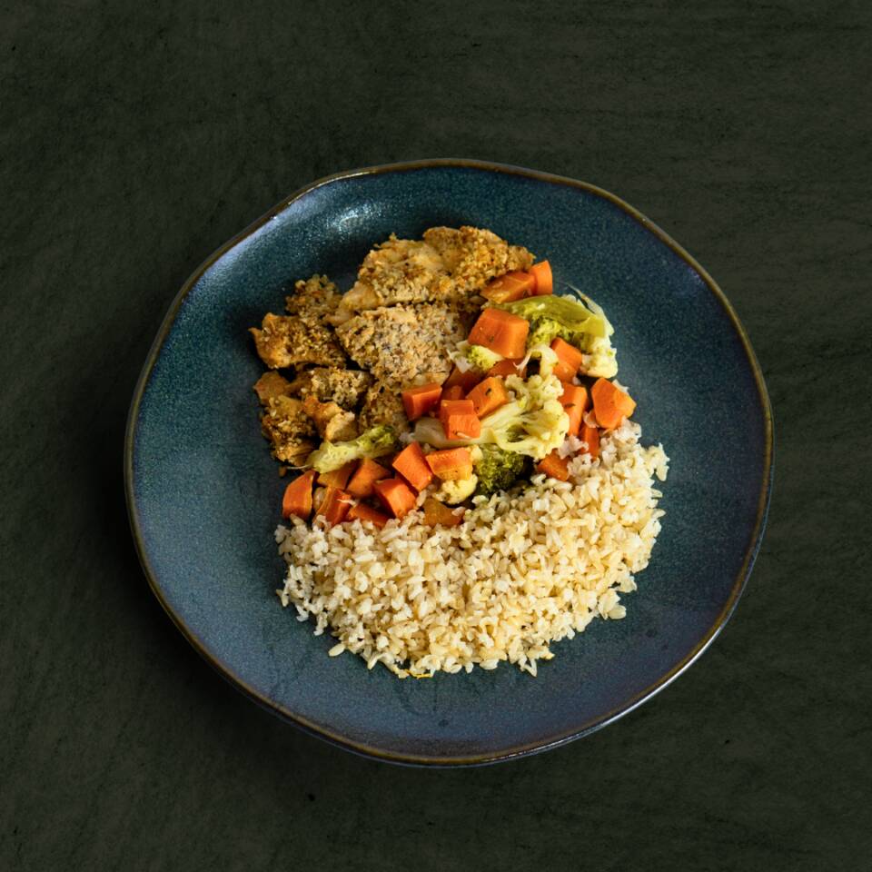 A crosta de castanhas agrega um toque sofisticado ao tenro filé de frango, enquanto o arroz integral garante uma refeição equilibrada e saudável. Os legumes sauteé, levemente temperados com chimichurri e lemon pepper, trazem uma explosão de cores e sabores.