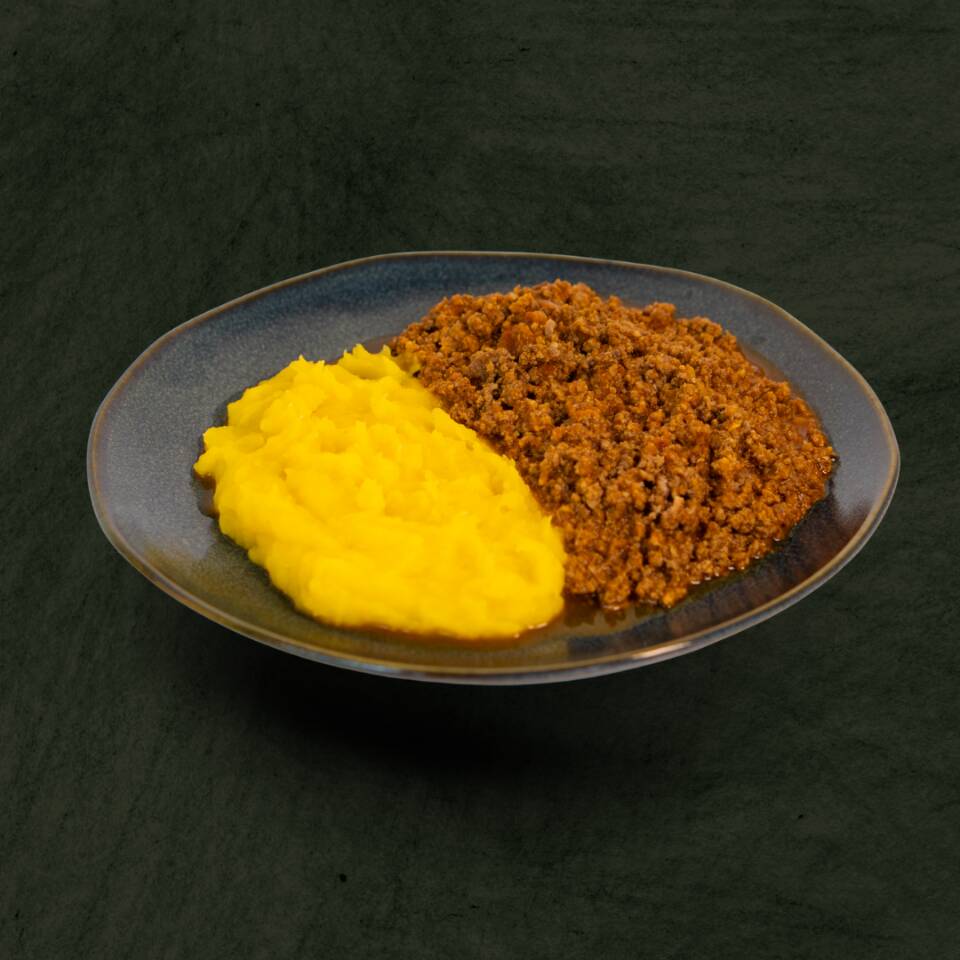 Patinho Moído com Purê de Mandioquinha Nosso patinho bovino moído é preparado com um refogado de tomate, cebola e cheiro verde. Acompanha um cremoso purê de mandioquinha. O prato é realçado com azeite de oliva extra virgem e um blend de temperos que inclui sal rosa, chimichurri, páprica doce, alho e um toque de pimenta do reino. Serve 1 Pessoa Peso Líquido: 400g