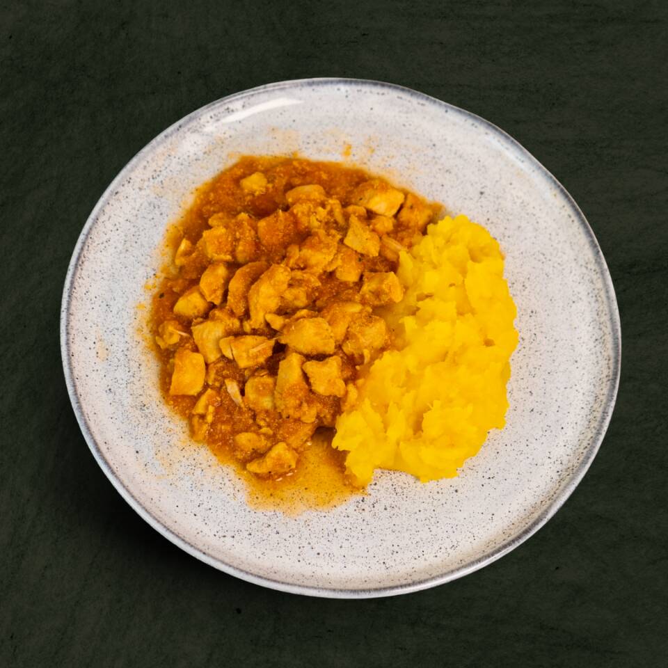 Cubos macios de peito de frango preparados com um refogado de tomate, cebola e cheiro verde. Acompanha um cremoso e aveludado purê de mandioquinha. Finalizado com temperos naturais: sal rosa, chimichurri, alho, páprica, azeite de oliva extra virgem e um toque de pimenta do reino. Serve 1 Pessoa Peso Líquido: 400g