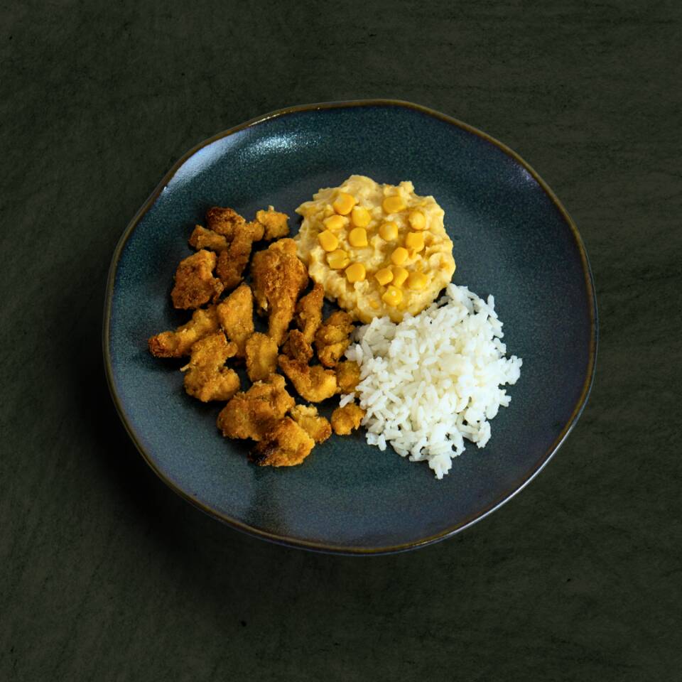 Iscas De Frango Com Creme De Milho E Arroz Branco