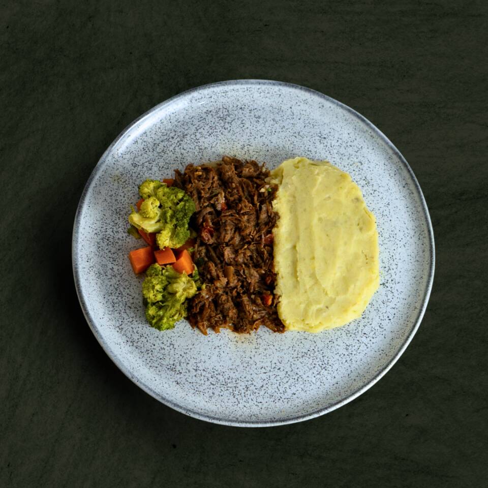 Carne Desfiada + Purê De Batata Doce + Legumes
