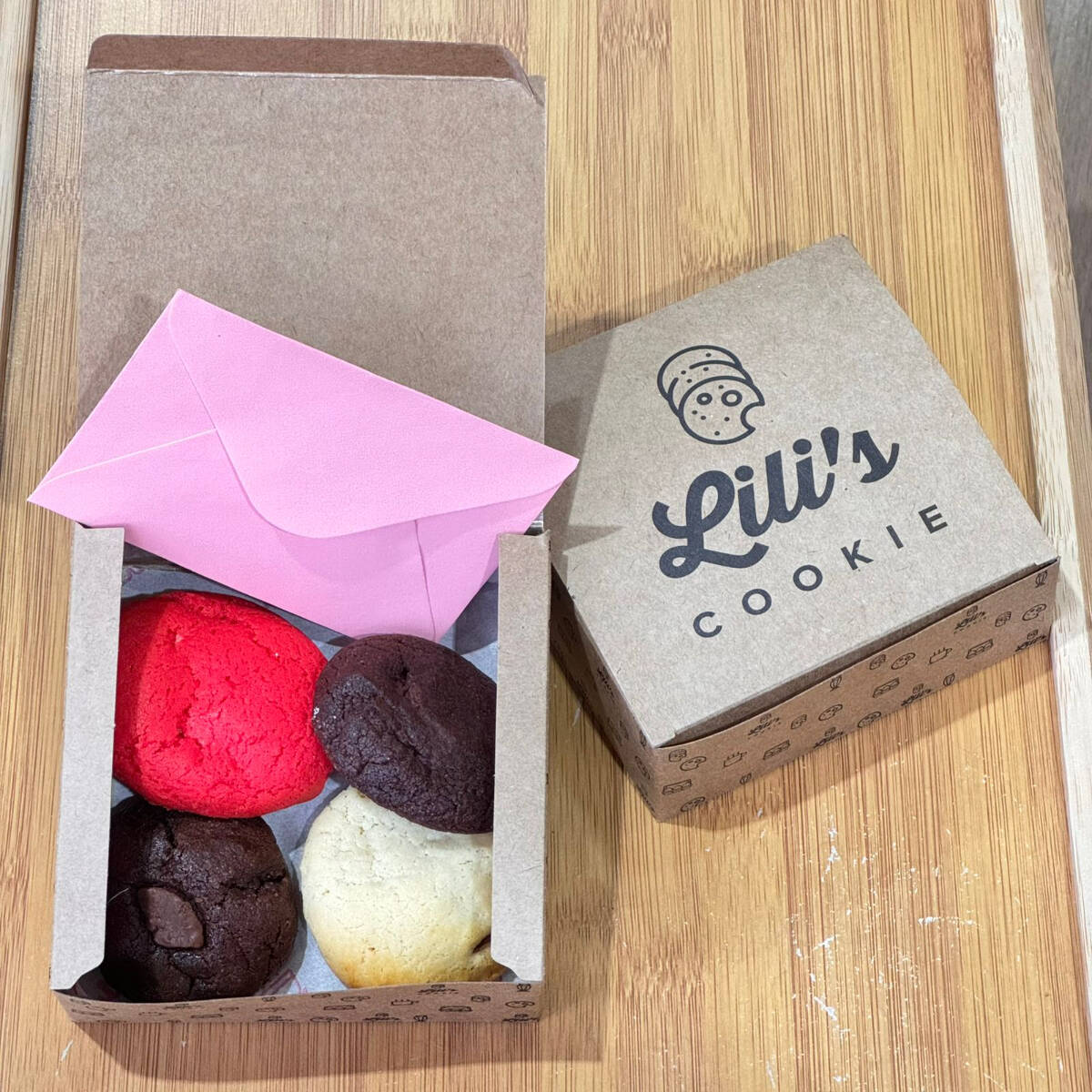 Apresentamos a Caixa Lili's Cookie com 15 mini cookies em quatro deliciosos sabores: tradicional ao leite, red velvet, meio amargo e ao leite.