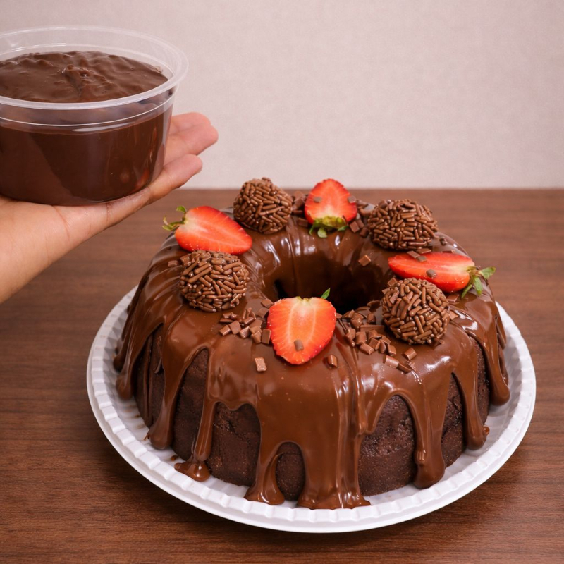 Bolo úmido de chocolate com explosão de brigadeiro caseiro. Puro prazer em cada fatia!” calda vulcão enviada separada