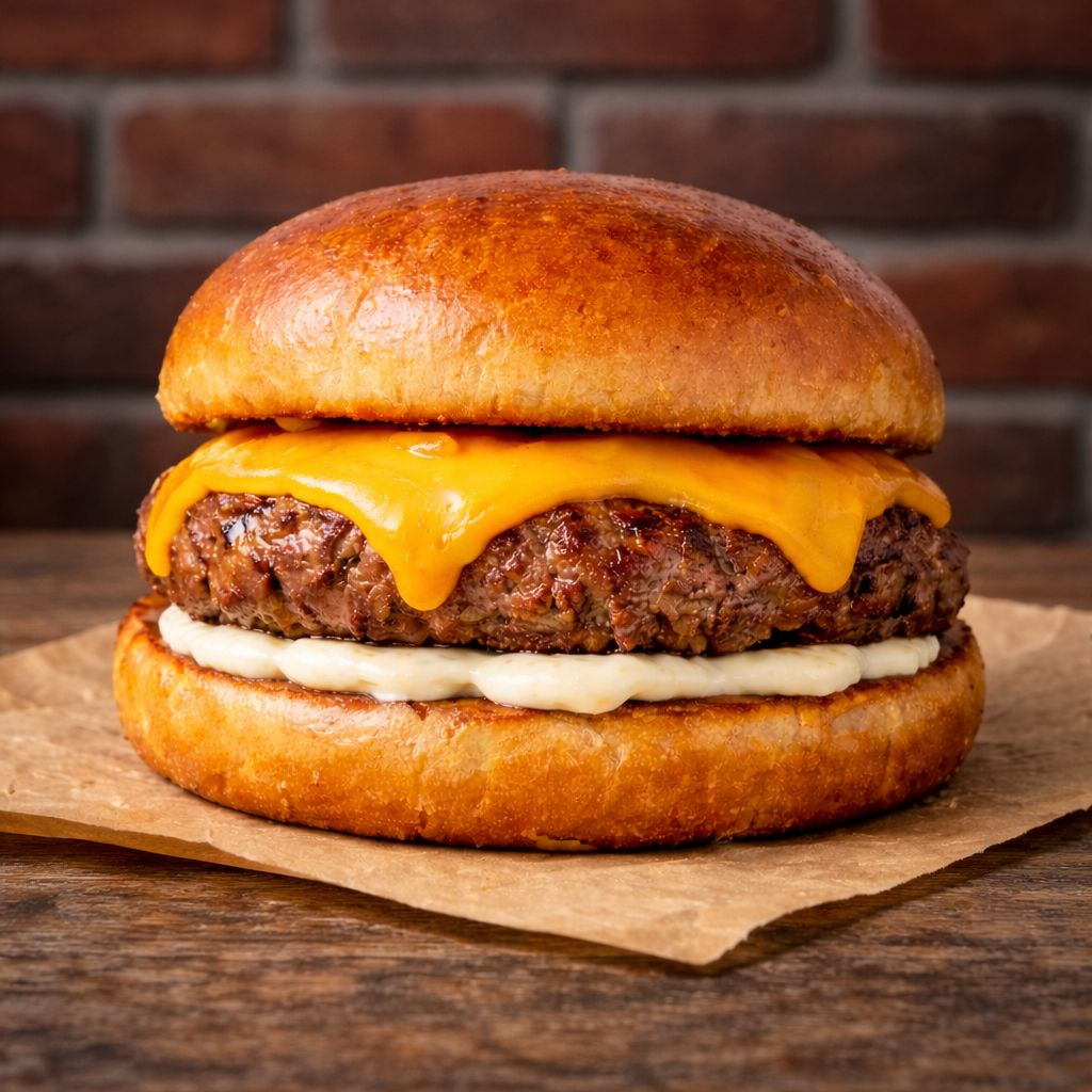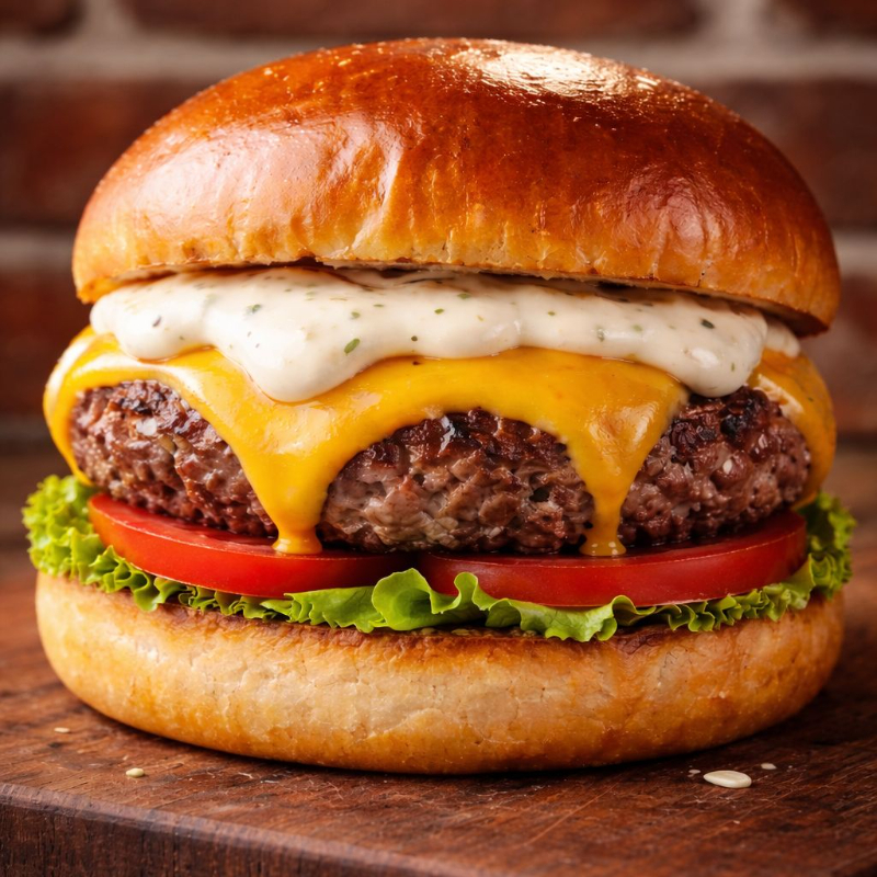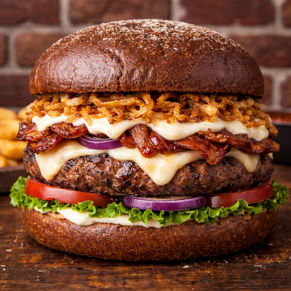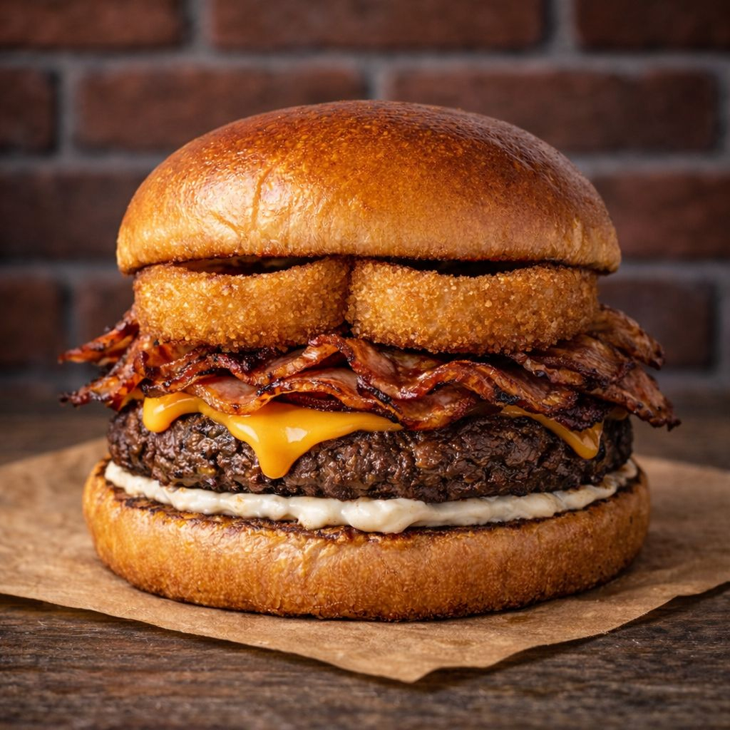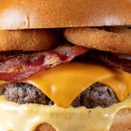 Sanduíche: No pão australiano 2 hambúrgueres de costela cobertos com queijo tipo cheddar fatias de bacon e um toque de barbecue