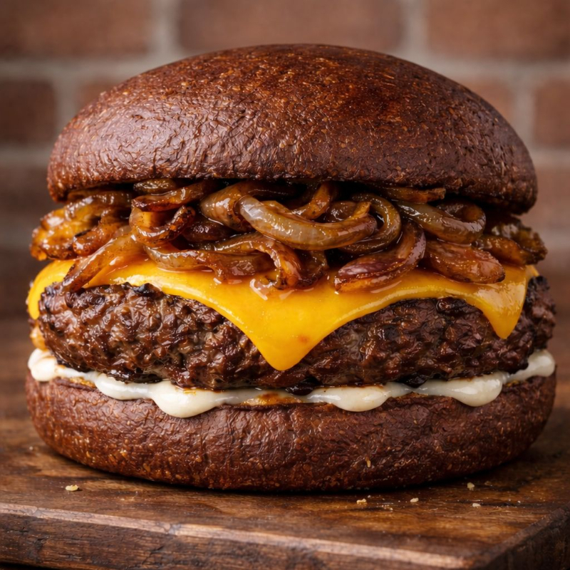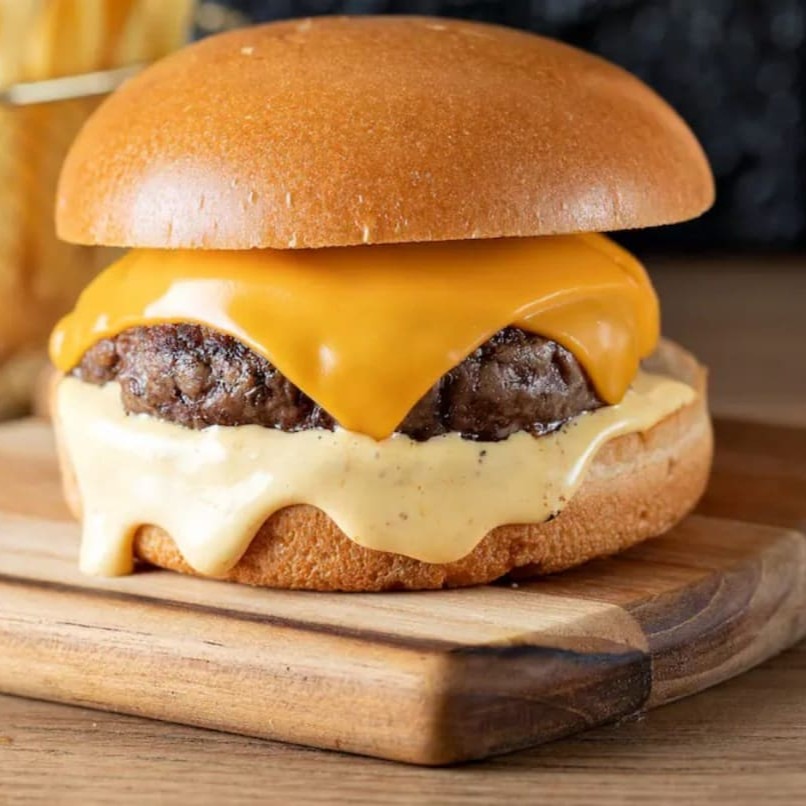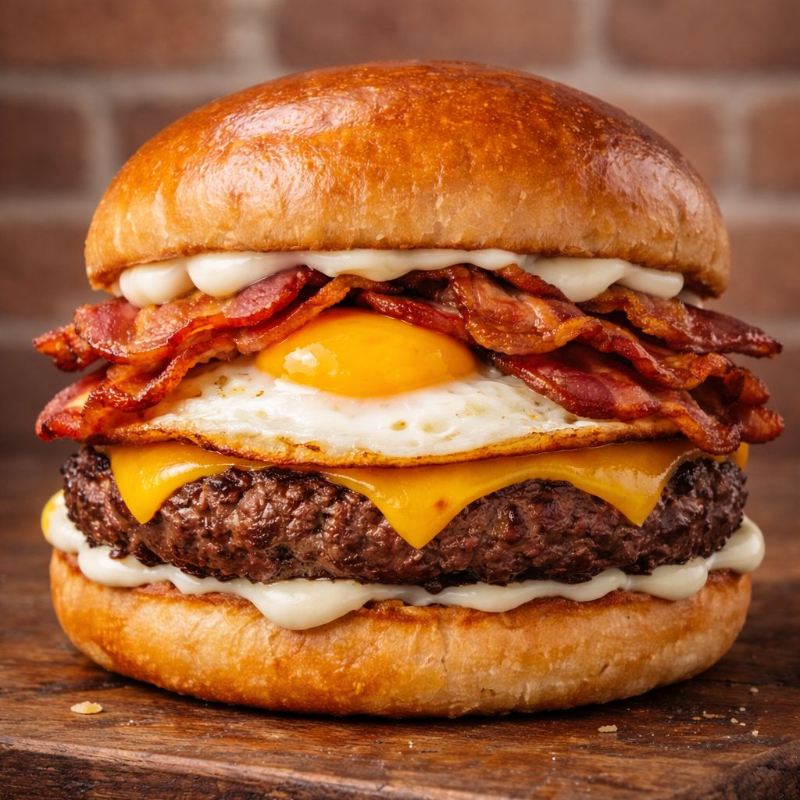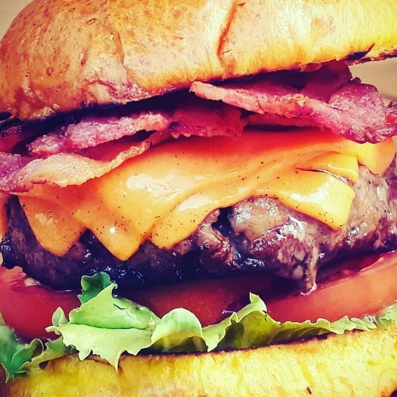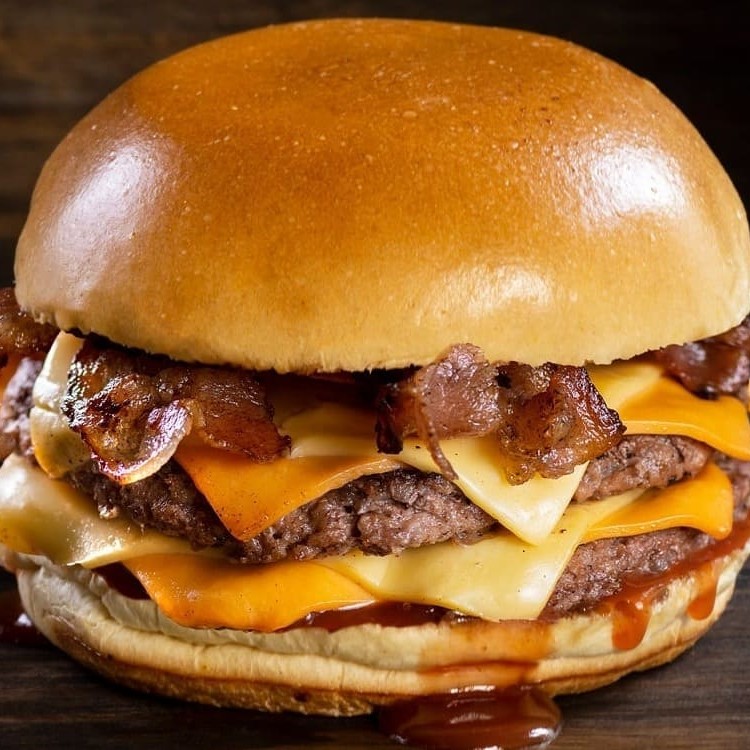 Sanduíche: No pão de brioche 2 hambúrgueres de costela cobertos com queijo cheddar melt uma camada generosa de bacon