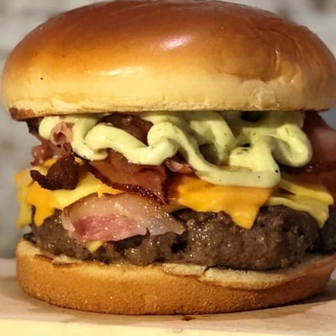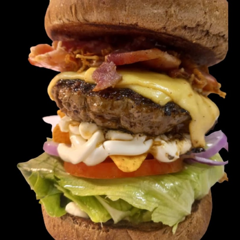 Carne com 100 gramas de costela angus coberto com queijo tipo cheddar fatias de bacon e anel de cebola deliciosa maionese da casa no pão de brioche