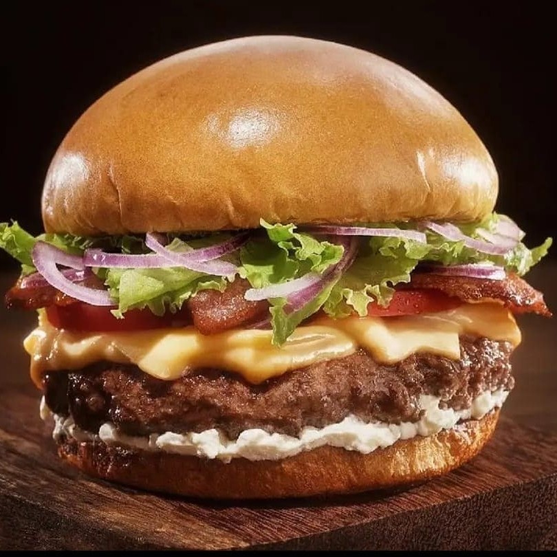 Sanduíche: Em nosso Pão Australiano Alface Tomate Cebola Roxa Catupiry Original* Hamburger Artesanal de Costela Angus 100 gramas Queijo Prato Bacon e Cebola Crispy.....