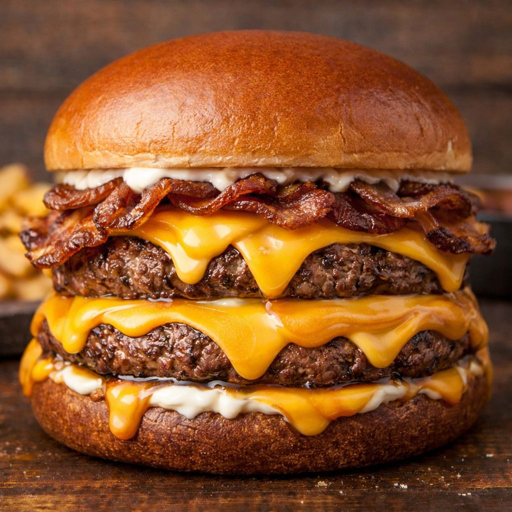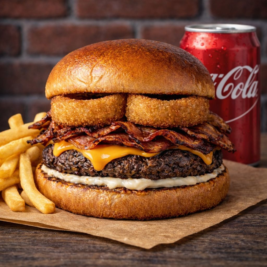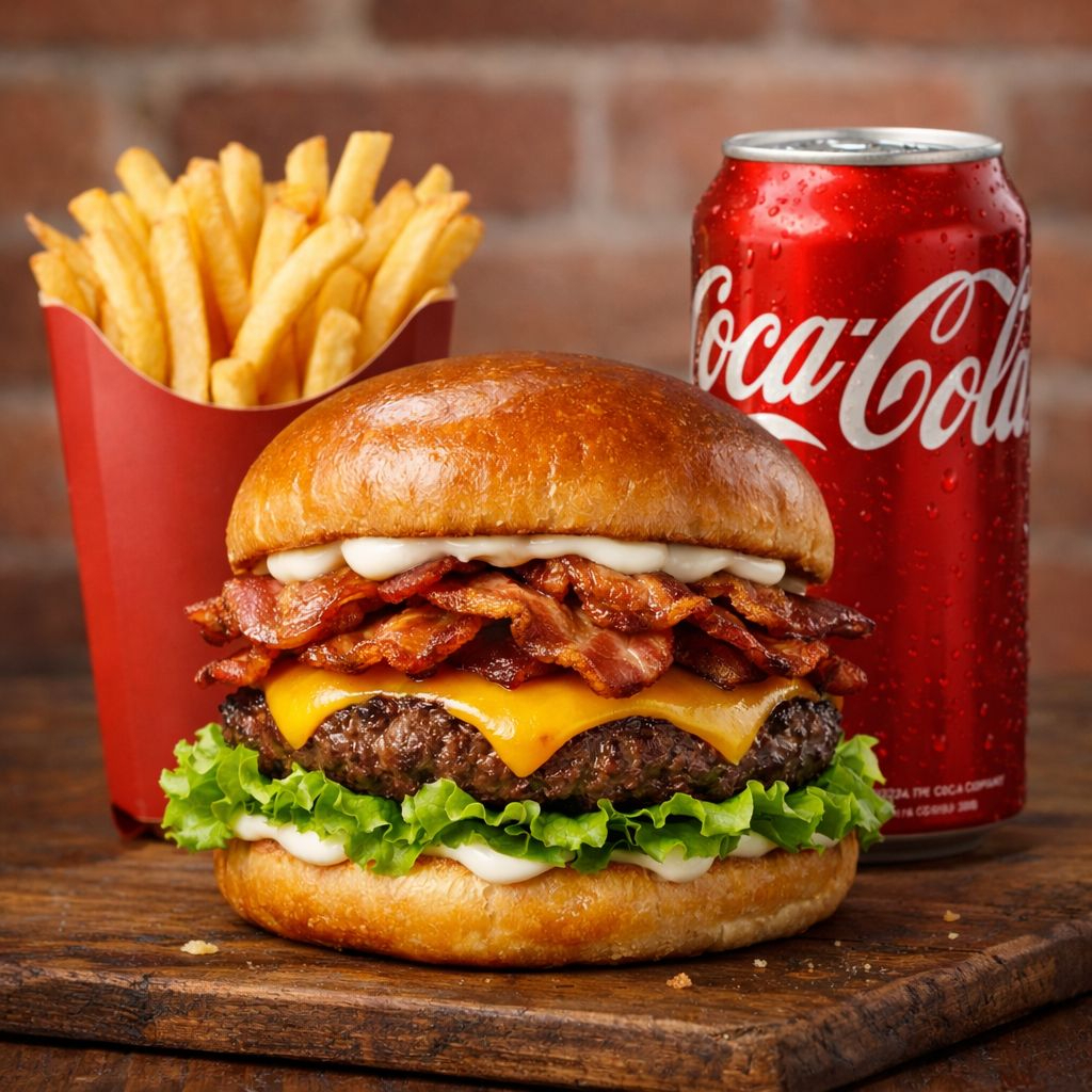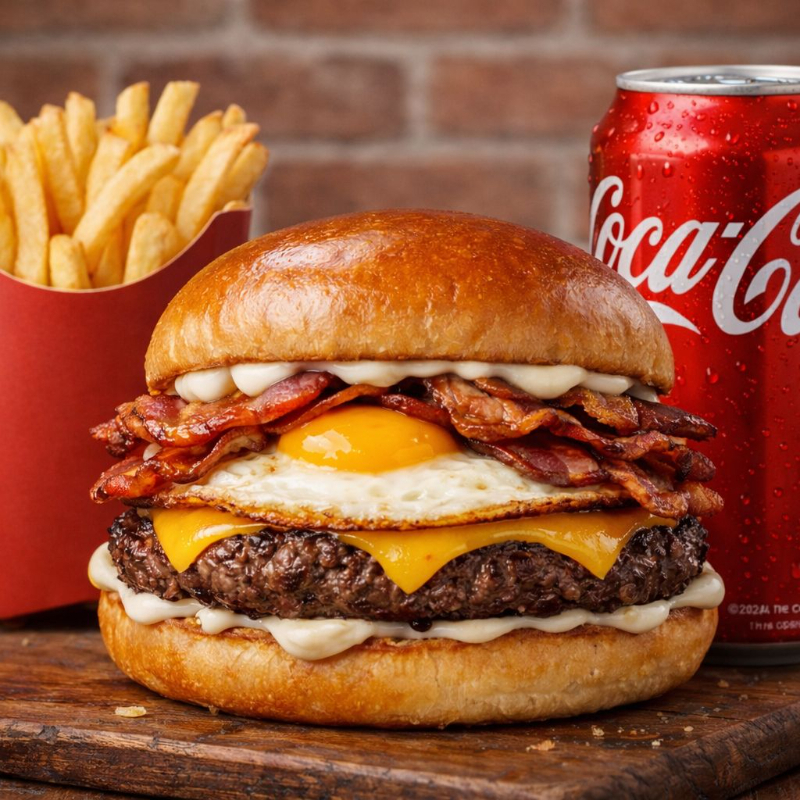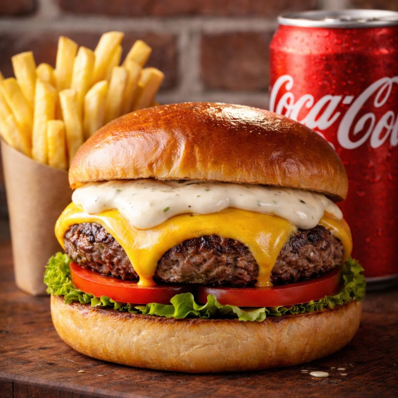 Desfrute de nosso Combo Duplo Mix Burger, uma combinação divina para os amantes de hambúrguer. Dentro de um pão de brioche tostado e macio, encontram-se dois suculentos hambúrgueres de costela, cuidadosamente grelhados e cobertos com uma generosa porção de mix de queijo prato e cheddar derretidos, realçados pela crocância das fatias de bacon. Acompanha uma porção de batatas fritas, crocantes por fora e macias por dentro, e uma refrescante Coca-Cola de 350 ml para completar essa experiência gastronômica incomparável.