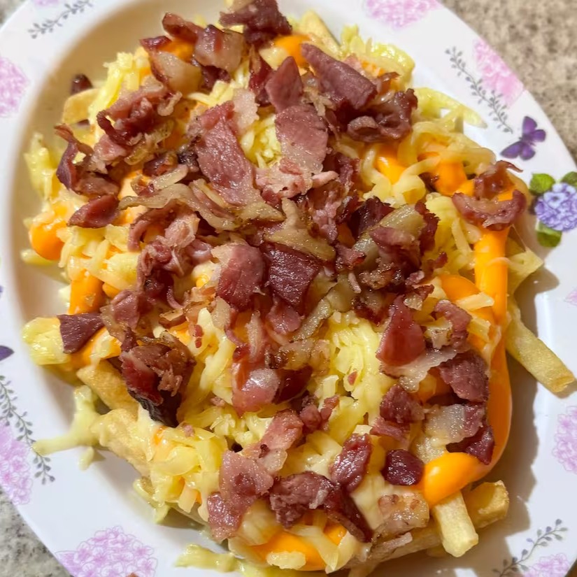 300 grs de batata frita, com cheddar, bacon e mussarela.
