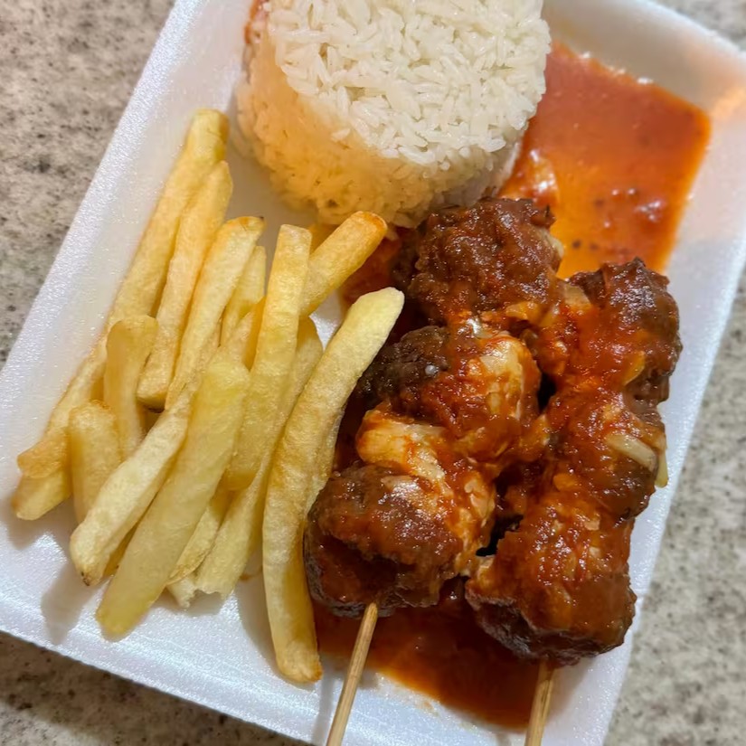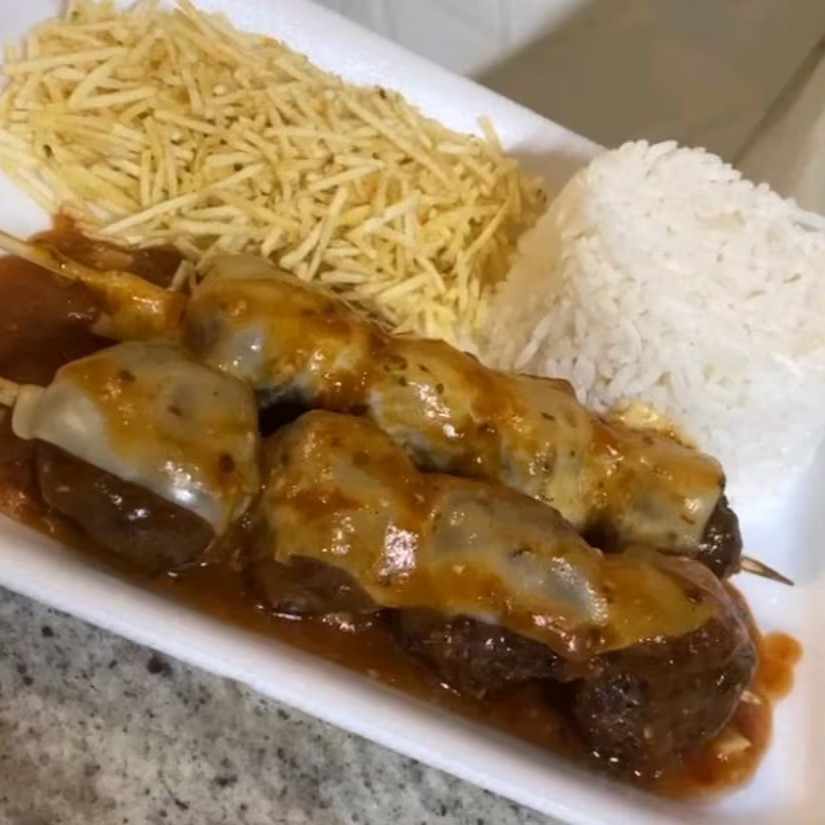Arroz, batata frita e 2 espetos de almôndega com molho e queijo