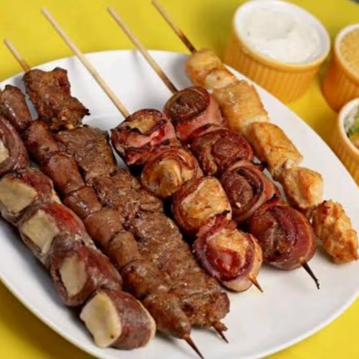 Opções de espetos: carne, frango, kafta, e pão de alho