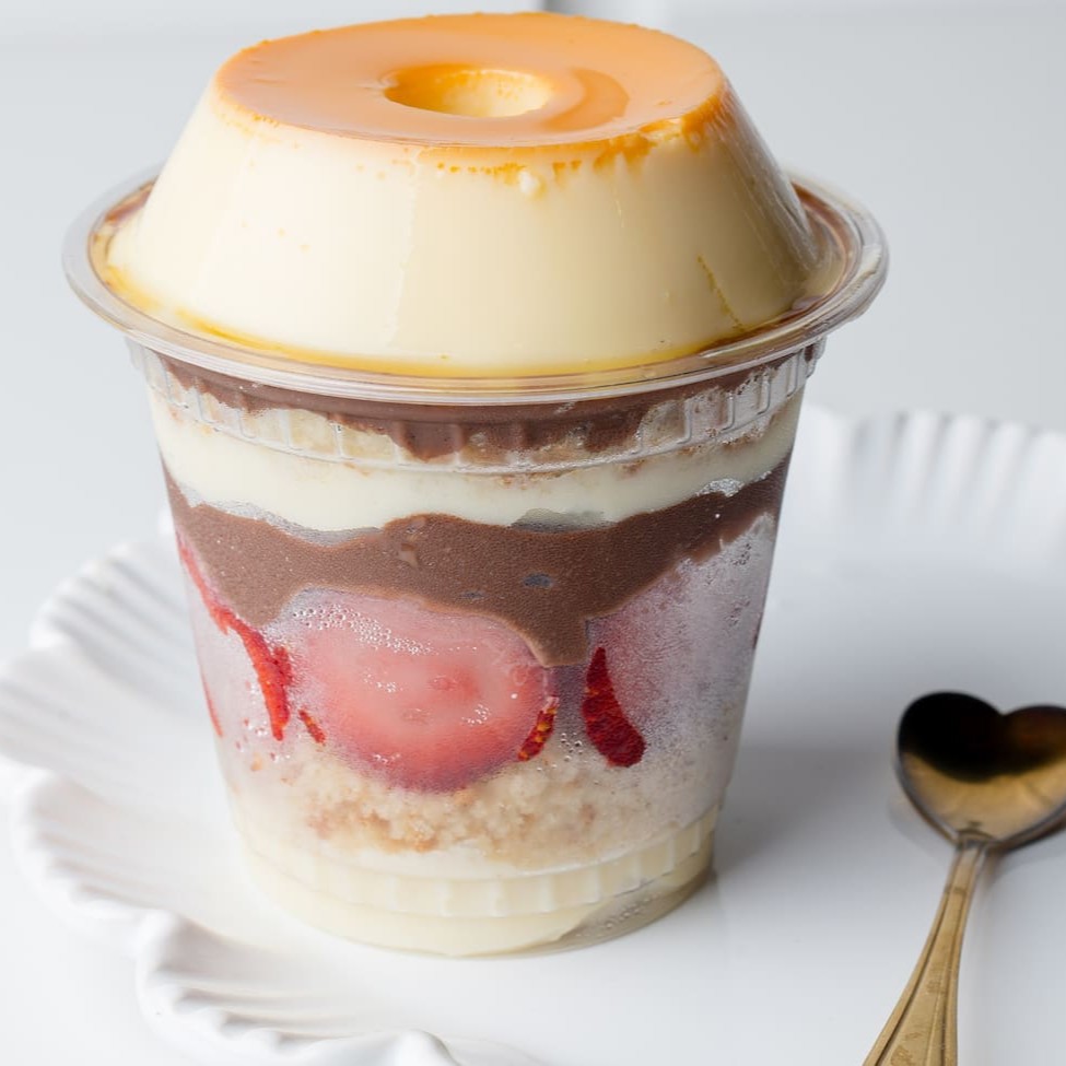 Copodim! Este doce é generosamente recheado com um suave Brigadeiro de Ninho, acompanhado de um Bolo amanteigado de textura perfeita. Acrescentamos ainda, frescos morangos, um sofisticado Brigadeiro Gourmet tradicional e, para finalizar, nosso inconfundível pudim de leite condensado. Uma experiência gastronômica que, certamente, irá te conquistar à primeira garfada!