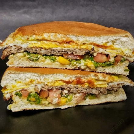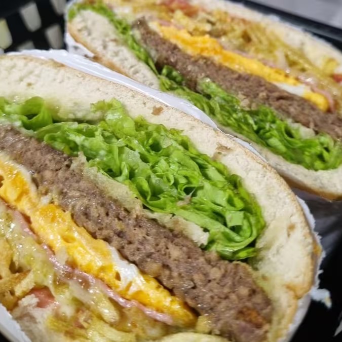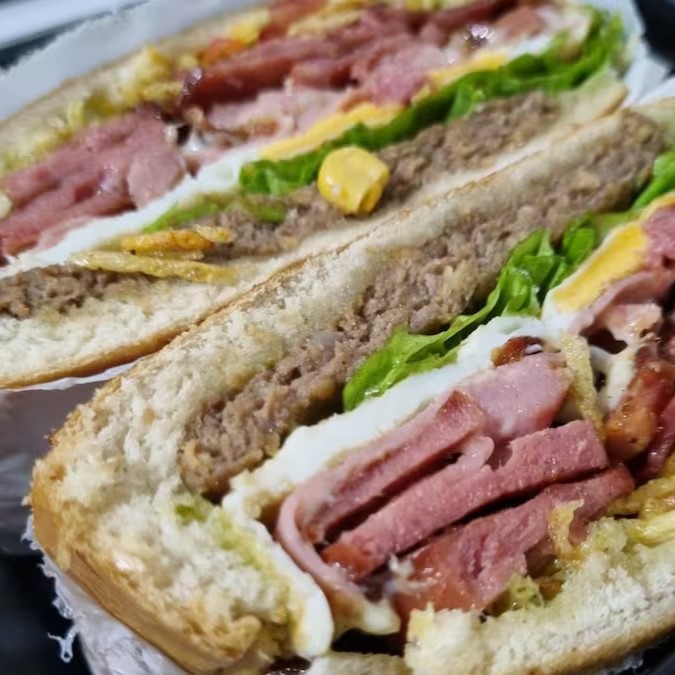 Hambúrguer, ovo, bacon, presunto, queijo mussarela, tomate, alface, milho e batata.