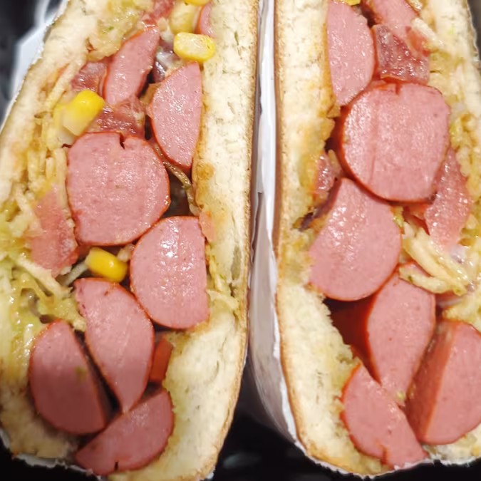 2 salsichas, presunto, queijo mussarela, tomate, milho e batata.