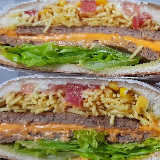 Hambúrguer, presunto, queijo mussarela, tomate, alface, milho e batata.