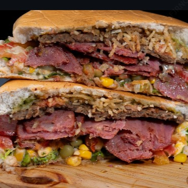 Hambúrguer, bacon, presunto, queijo mussarela, tomate, alface, milho e batata.
