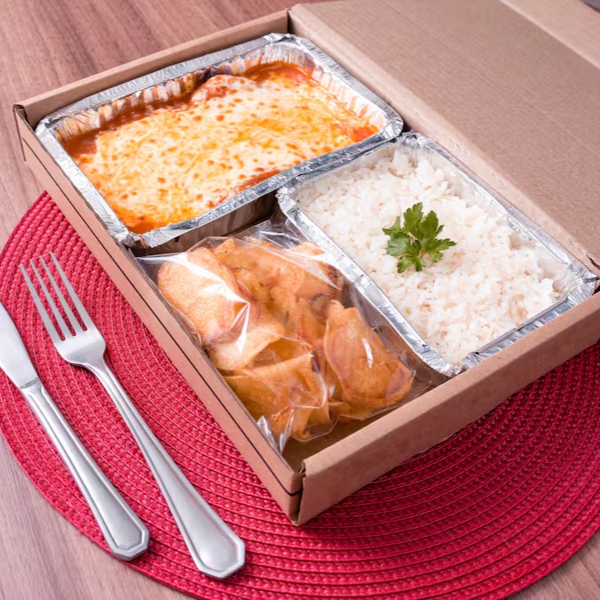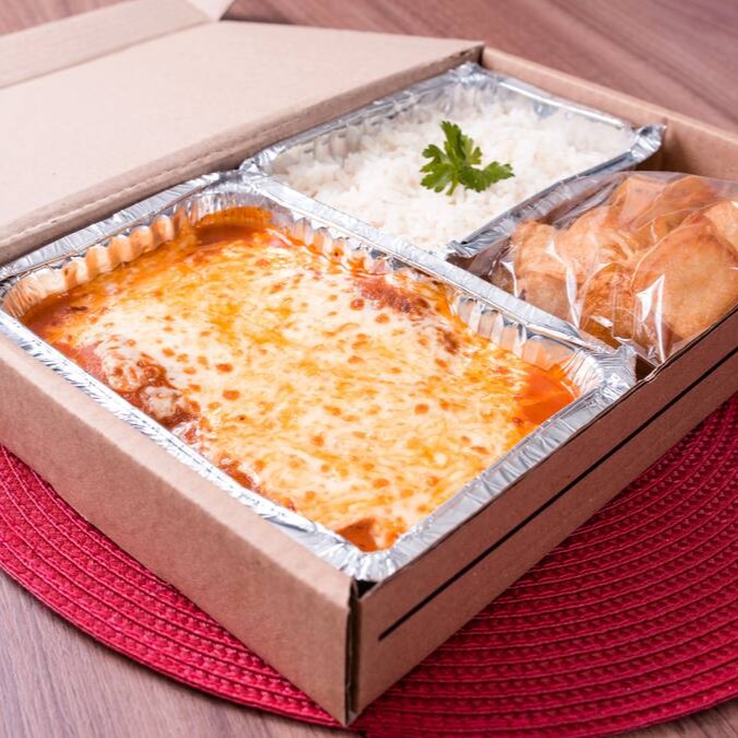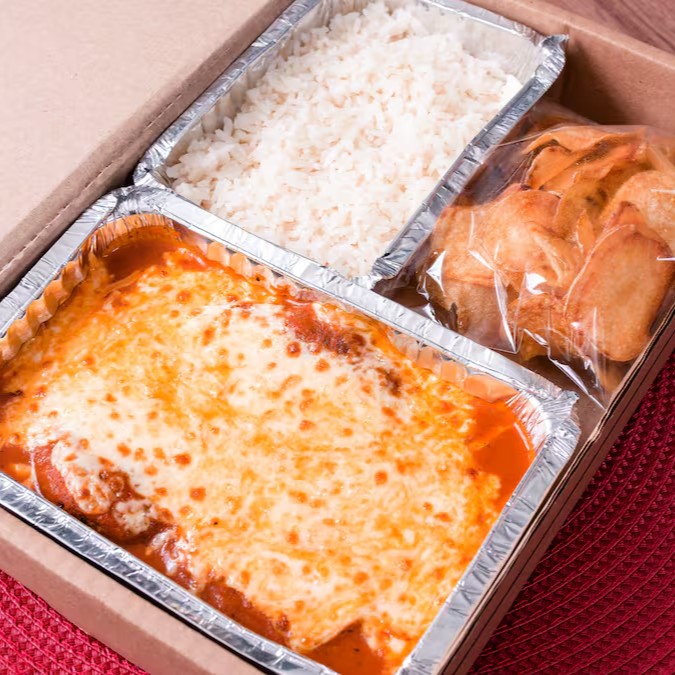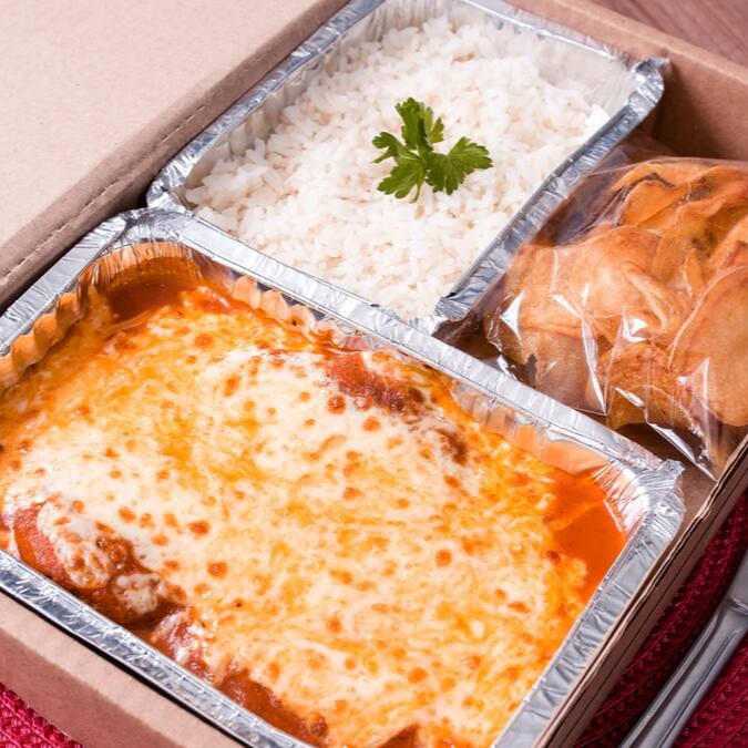 Berinjela empanada, frita até ficar dourada e crocante, coberta com nosso molho artesanal de tomates frescos e gratinada com uma generosa camada de queijo derretido. Acompanha porção de arroz branco soltinho e batatas chips fritas sequinhas.