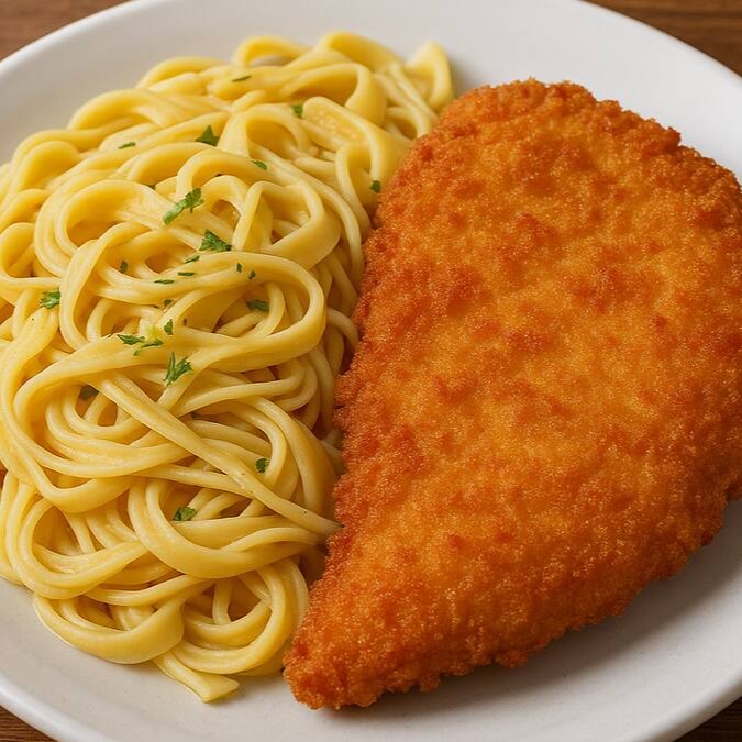 Thalharim al dente, servido com o molho de sua preferência, acompanhado de um filé de frango empanado, dourado e crocante por fora, macio e suculento por dentro.