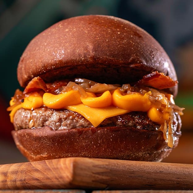 Hambúrguer bovino de 90g temperado com nosso dry rub, cheddar cremoso, cebola caramelizada, bacon crocante, maionese clássica no pão australiano.