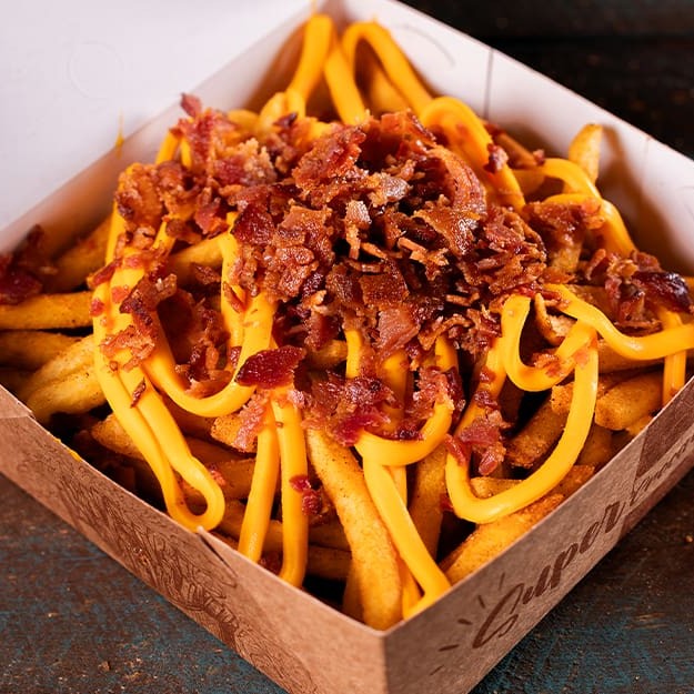 400g de batata frita Surecrisp temperada com nosso exclusivo dry rub, coberta com queijo cheddar cremoso e bacon crocante. (peso da batata in natura)