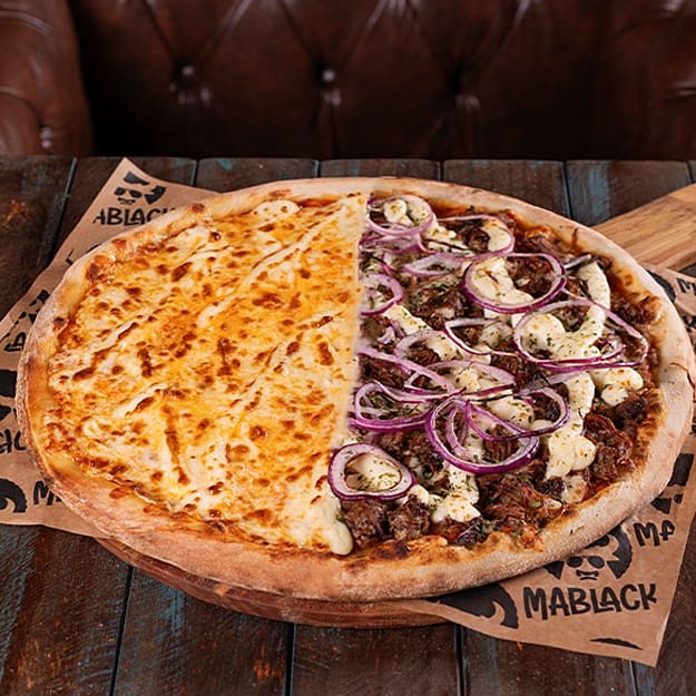 Escolha metade de um sabor e metade do outro, porque aqui todo mundo sai feliz e prova as melhores pizzas da vida <3 São mais de 30 opções para você conhecer a Mablack Pizza & Burger. Booooora!