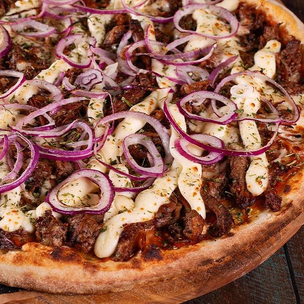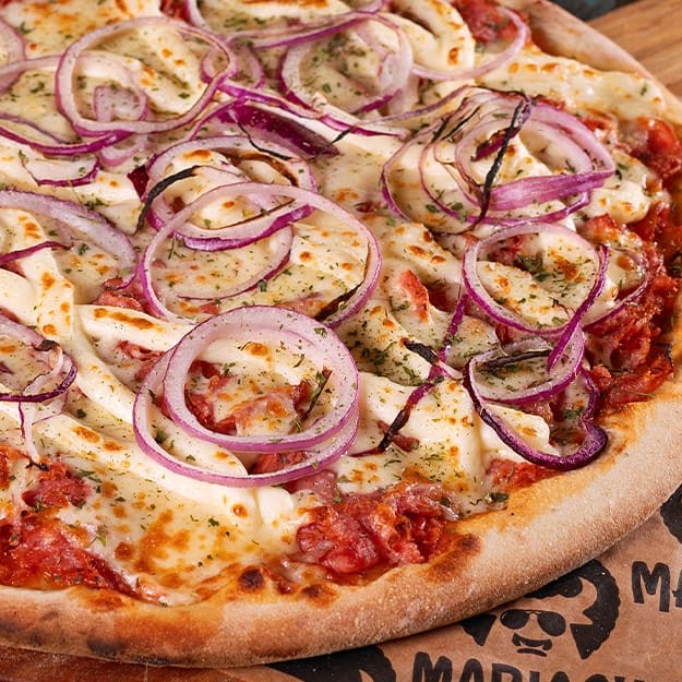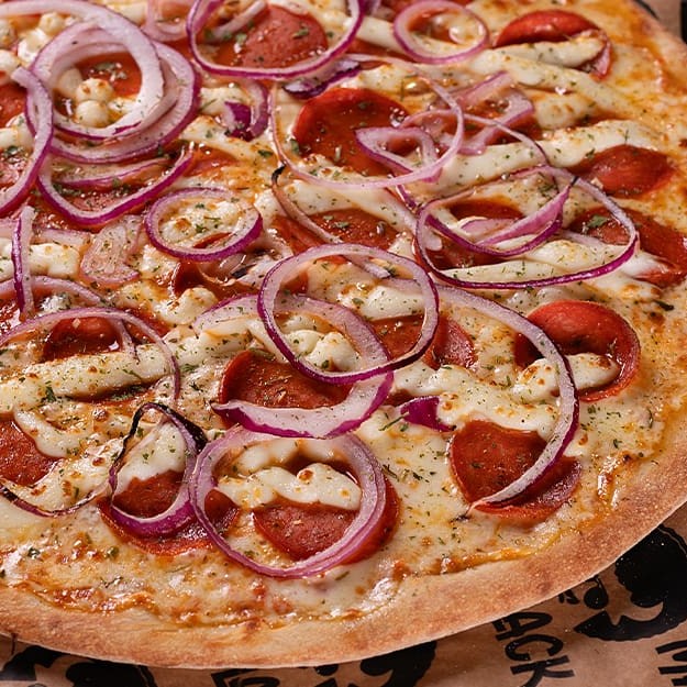 Pizza saborosa com calabresa fatiada bem fininha, mussarela, Catupiry, cebola roxa, orégano, molho de tomate caseiro com toque de manjericão, massa artesanal de longa fermentação e azeitonas (opcional).