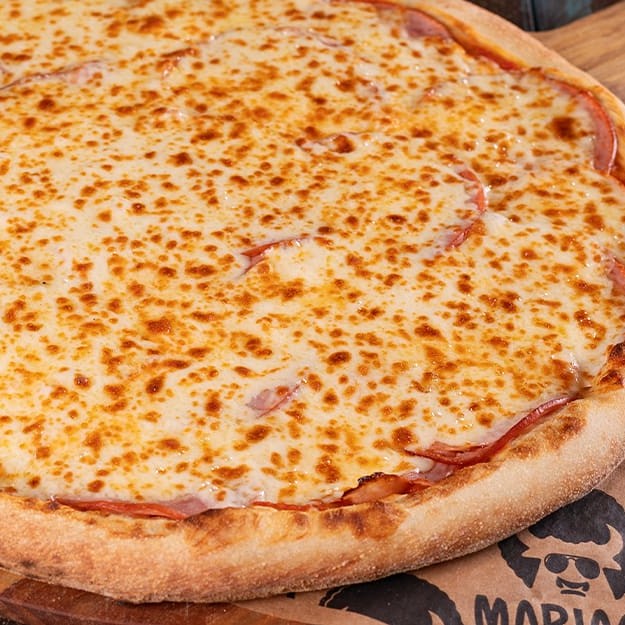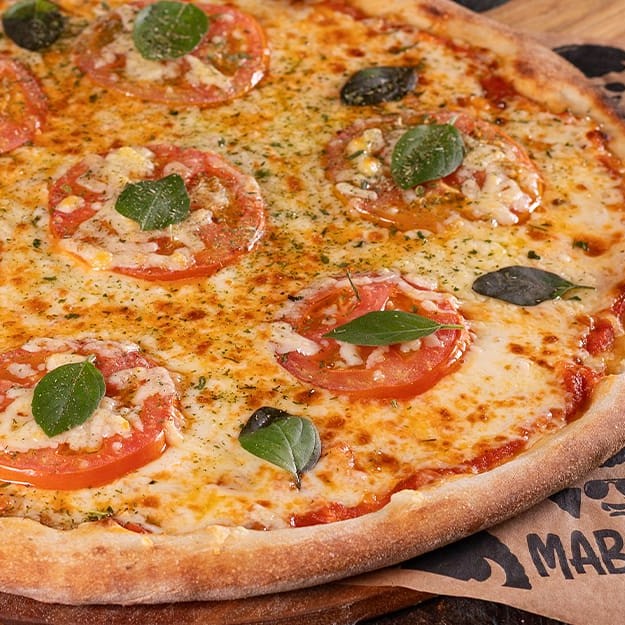 Muçarela, molho de tomate caseiro com toque de manjericão, massa artesanal de longa fermentação, orégano e azeitona