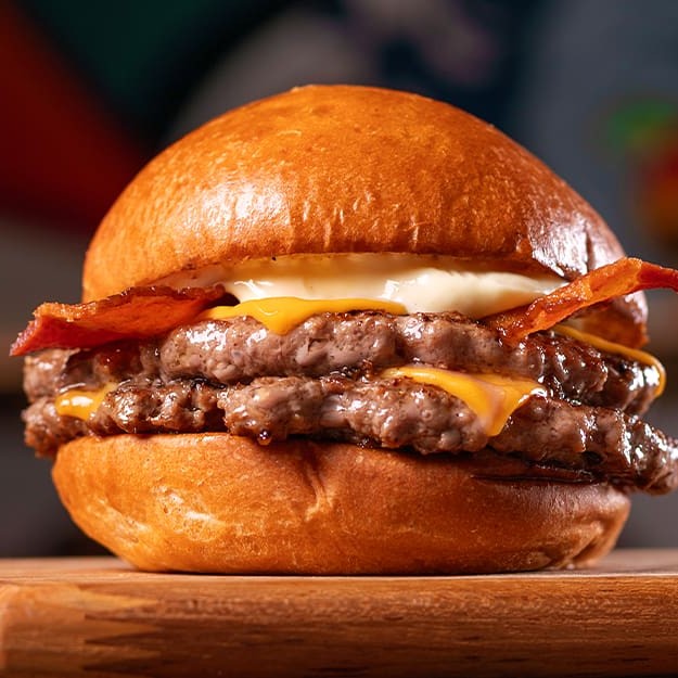 Dois hambúrgueres bovinos de 90g temperados com nosso dry rub, queijo cheddar, bacon crocante, maionese clássica no pão brioche.