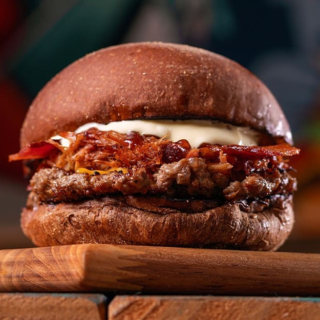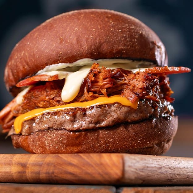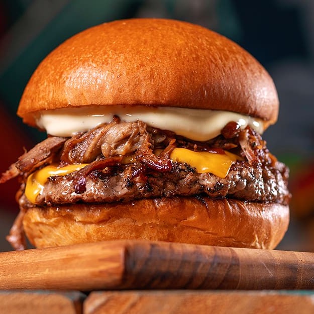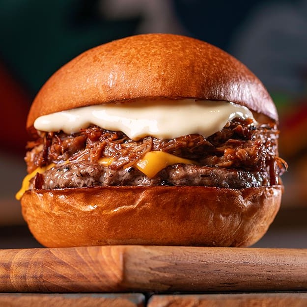 Hambúrguer bovino de 90g temperado com nosso dry rub, pulled pork (copa lombo suíno defumado e desfiado), queijo cheddar, bacon crocante, maionese clássica no pão australiano.
