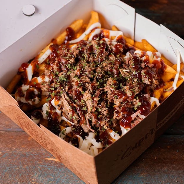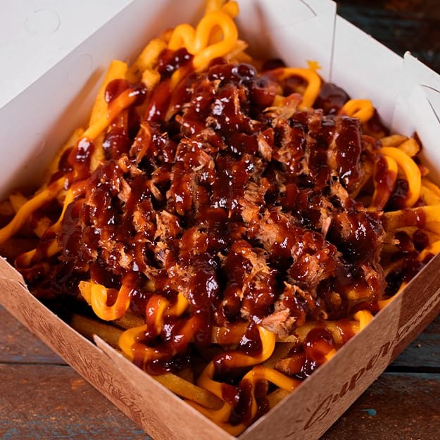 400g da nossa deliciosa batata frita Surecrisp temperada com dry rub, coberta com cheddar, pulled pork (copa lombo defumado e desfiado) e finalizada com nosso barbecue artesanal feito na casa. (peso da batata in natura)
