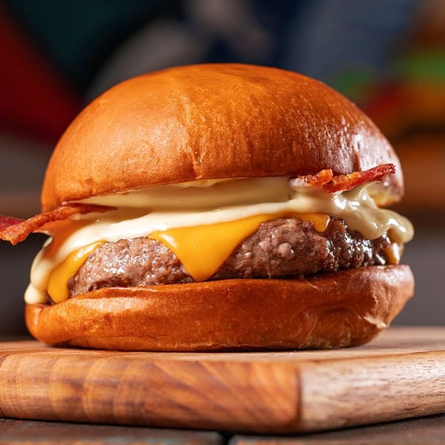 Hambúrguer bovino de 150g temperados com nosso dry rub, queijo cheddar, bacon crocante, maionese clássica no pão brioche.