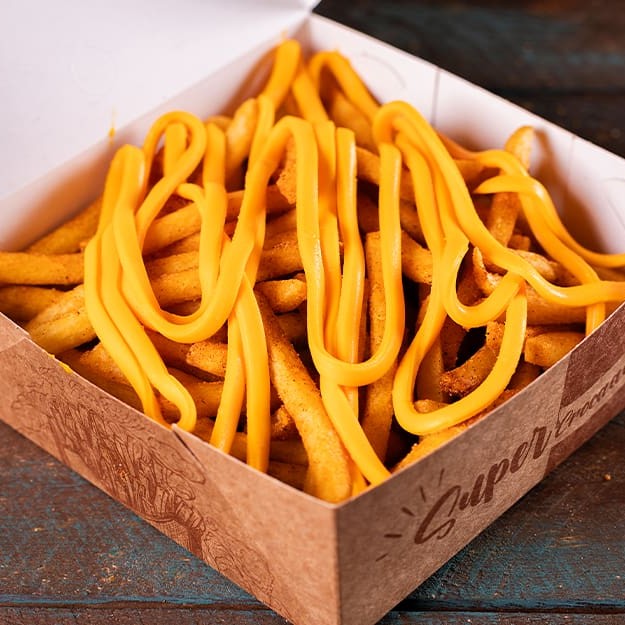 400g de batata frita Surecrisp temperada com nosso exclusivo dry rub, coberta com queijo cheddar cremoso. (peso da batata in natura)