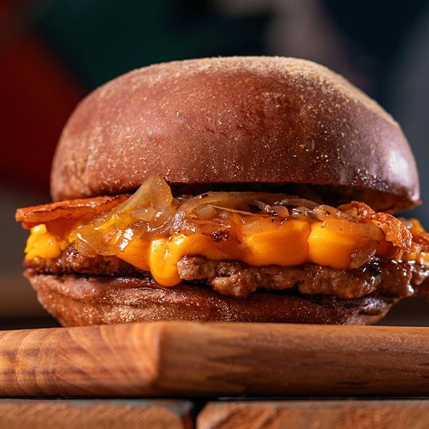 Hambúrguer bovino de 150g temperado com nosso dry rub, cheddar cremoso, cebola caramelizada, bacon crocante, maionese clássica no pão australiano.